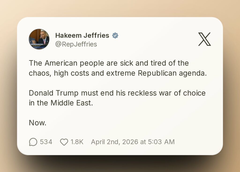 Jeffries called on Trump to immediately end what he termed a “reckless war of choice” in the Middle East, emphasizing the growing frustration among citizens over prolonged instability.