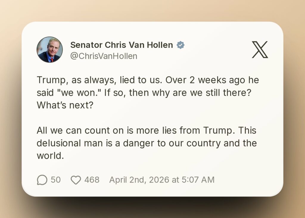 Meanwhile, Senator Chris Van Hollen accused Trump of misleading the public, pointing out contradictions in his earlier claims of victory. “If we already won, why are we still there?” Van Hollen questioned, warning that continued inconsistency and misinformation could further destabilize both domestic and international confidence.