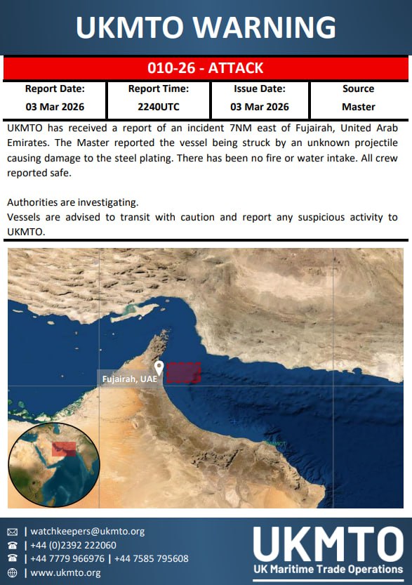 برطانوی میری ٹائم ٹریڈ آپریشنز کے مطابق منگل کی رات تقریباً 10:40 بجے فجیرہ کے مشرق میں 7 ناٹیکل میل کے فاصلے پر موجود ایک تجارتی جہاز کو نامعلوم ڈرون یا پروجیکٹائل آ کر لگا جس کے نتیجے میں جہاز کی اسٹیل پلیٹنگ کو نقصان پہنچا۔